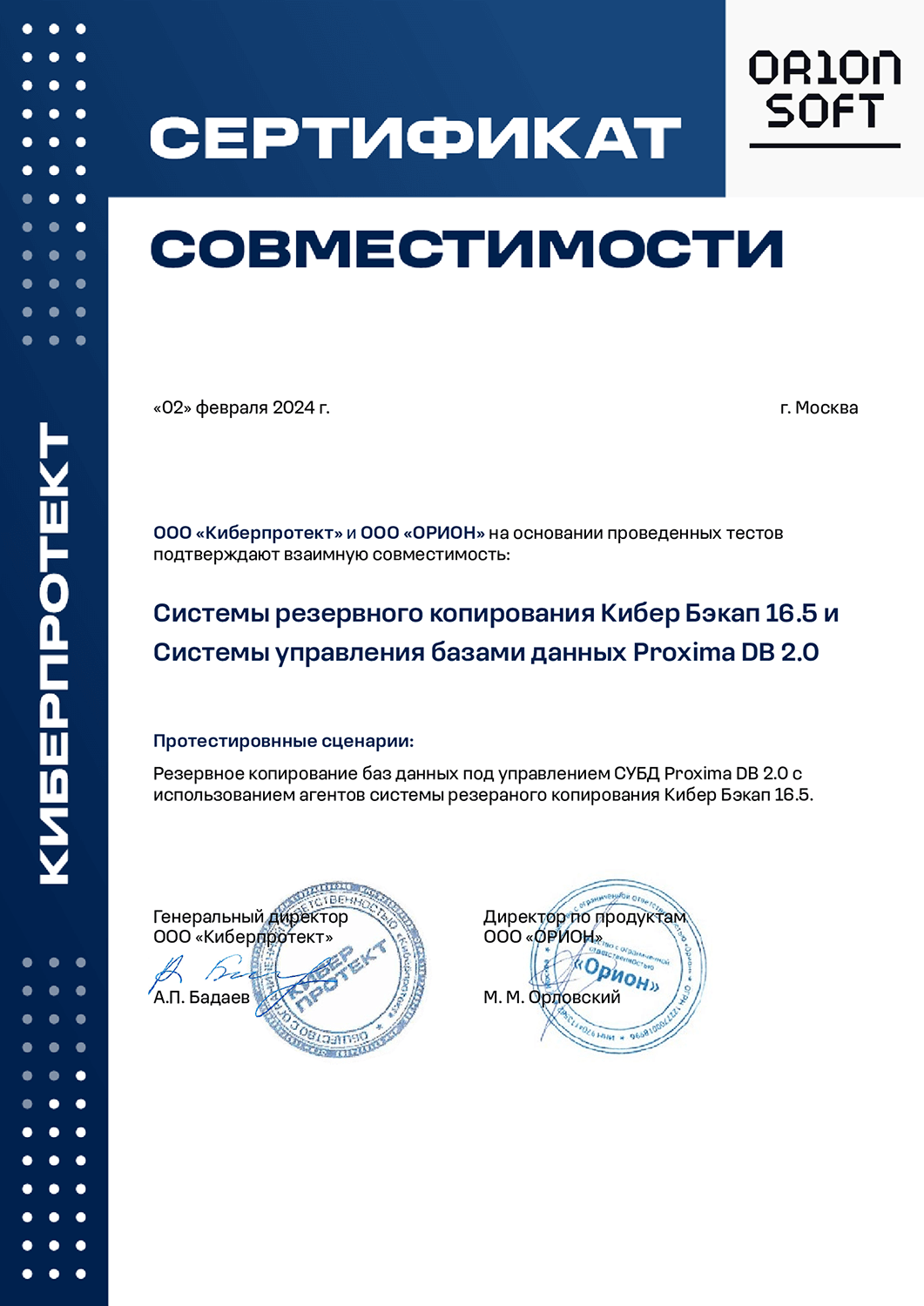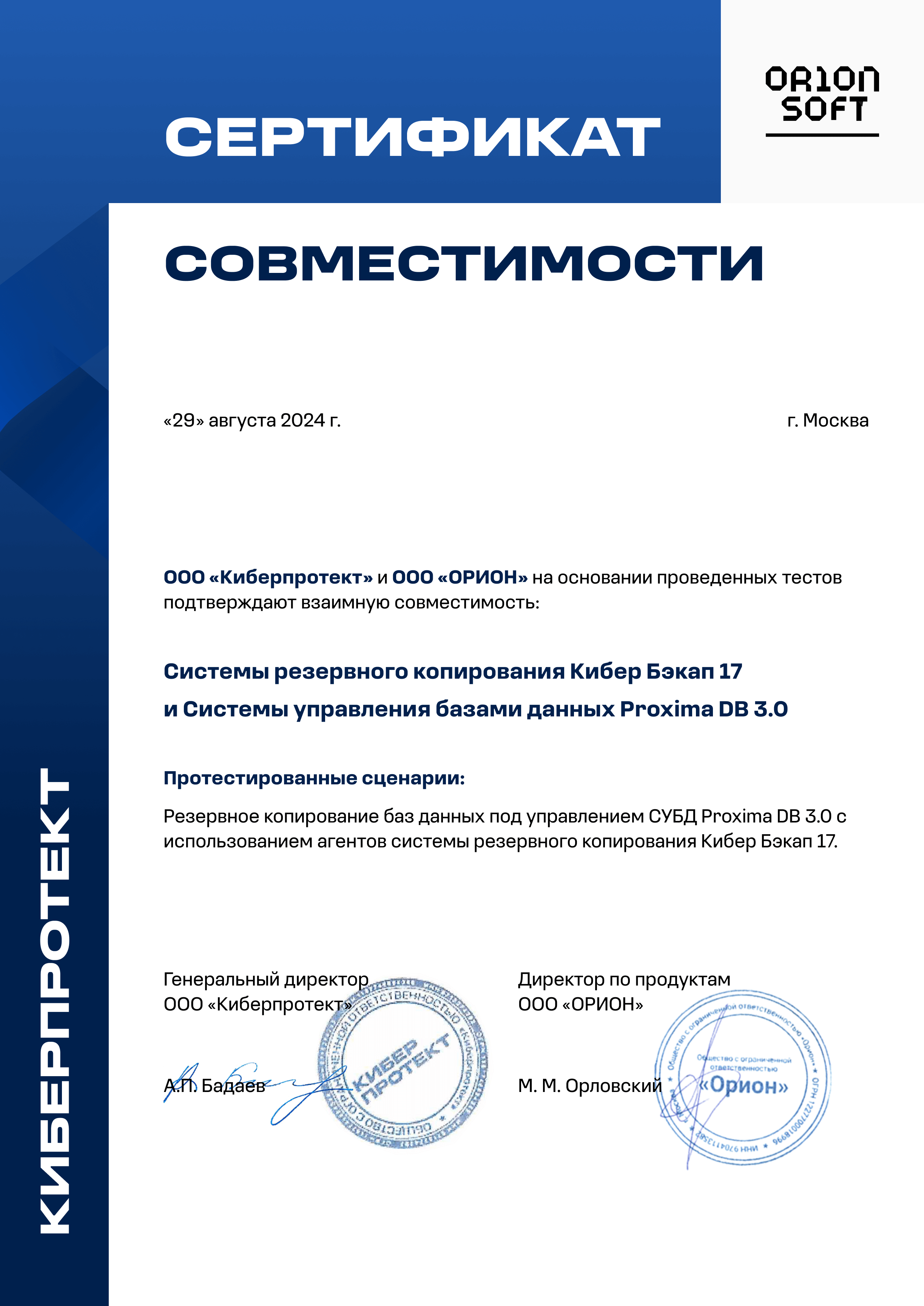 Решение обеспечивает резервное копирование баз данных под управлением Proxima DB посредством СРК Кибер Бэкап 16.5 с использованием дополнительного агента. Поддерживается полное и инкрементное резервное копирование. В качестве хранилищ резервных копий можно использовать локальные папки, сетевые папки, NFS, узлы хранения и ленты. Доступна также настройка расписания резервного копирования: всегда полное, еженедельно полное, ежедневно инкрементное или другое (пользовательская схема).
