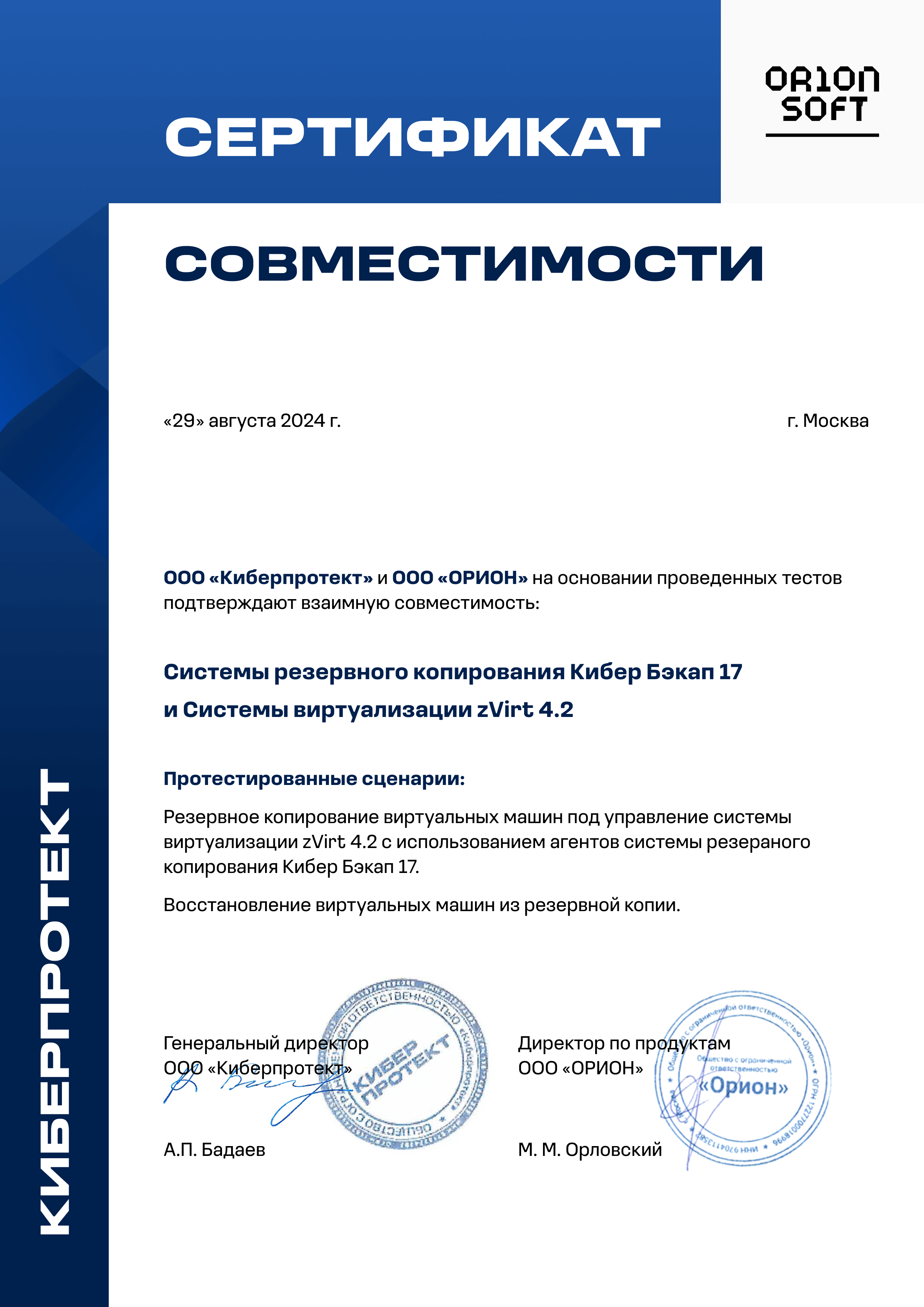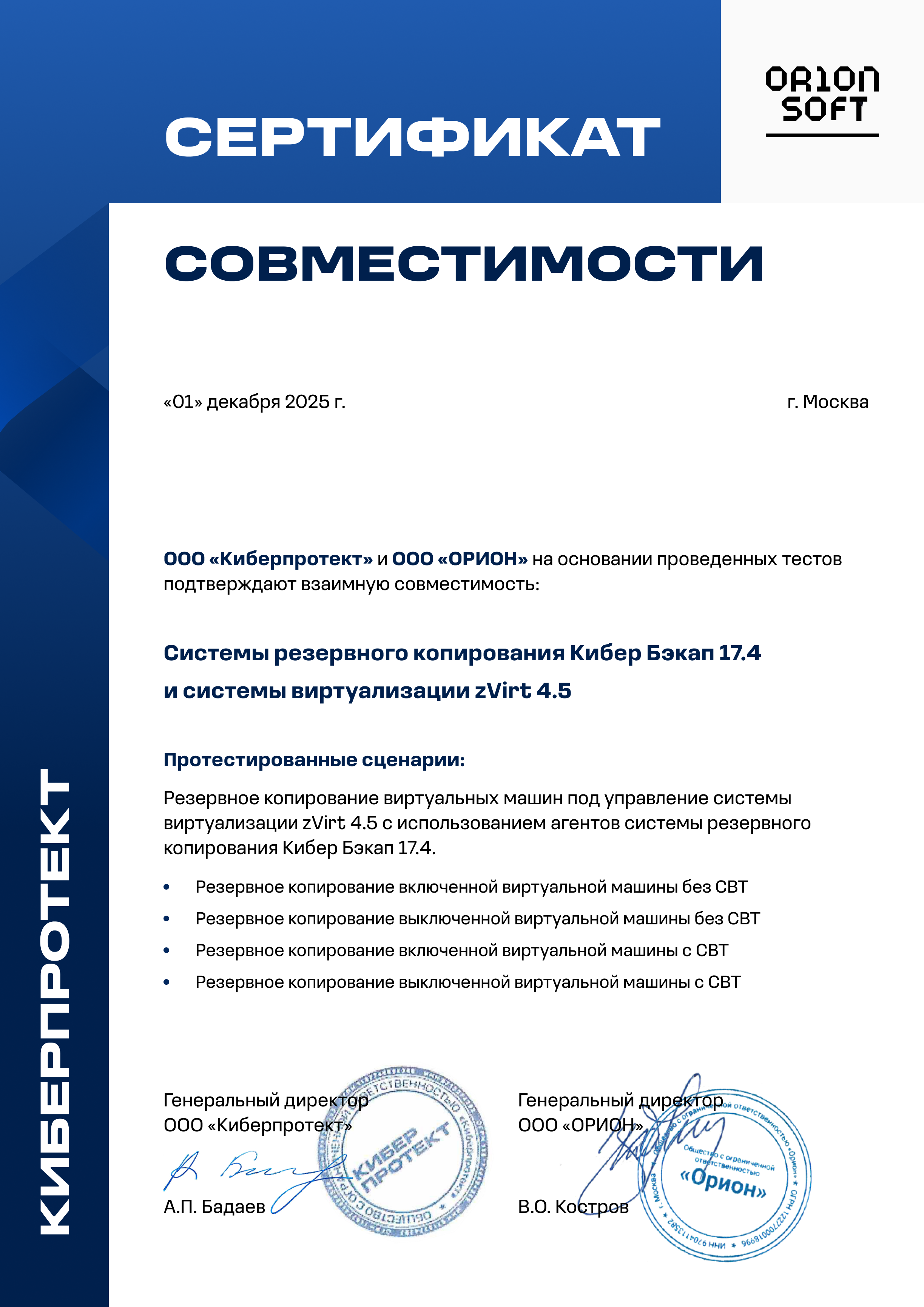 Интеграция СРК Кибер Бэкап c системой безопасного управления средой виртуализации zVirt позволяет обеспечить пользователям zVirt бесперебойную работу виртуальных машин и минимизировать срок восстановления критически важных систем. Резервное копирование и восстановление всех виртуальных машин и данных выполняется без необходимости установки агентов на каждую виртуальную машину.