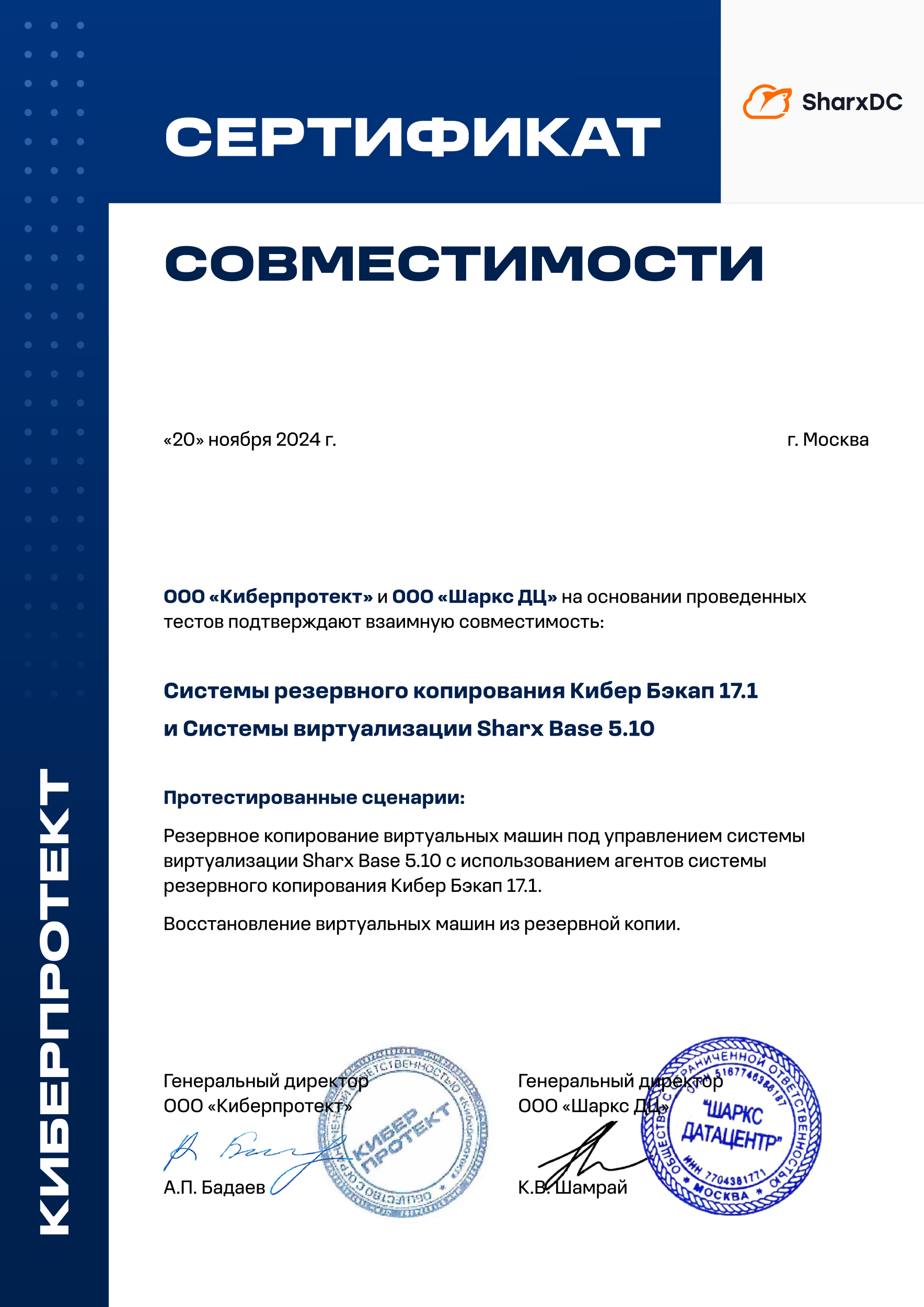 Кибер Бэкап обеспечивает надежное и резервное копирование с использованием агента в гостевой виртуальной машине и восстановление виртуальных машин под управлением платформы виртуализации SharxBase.