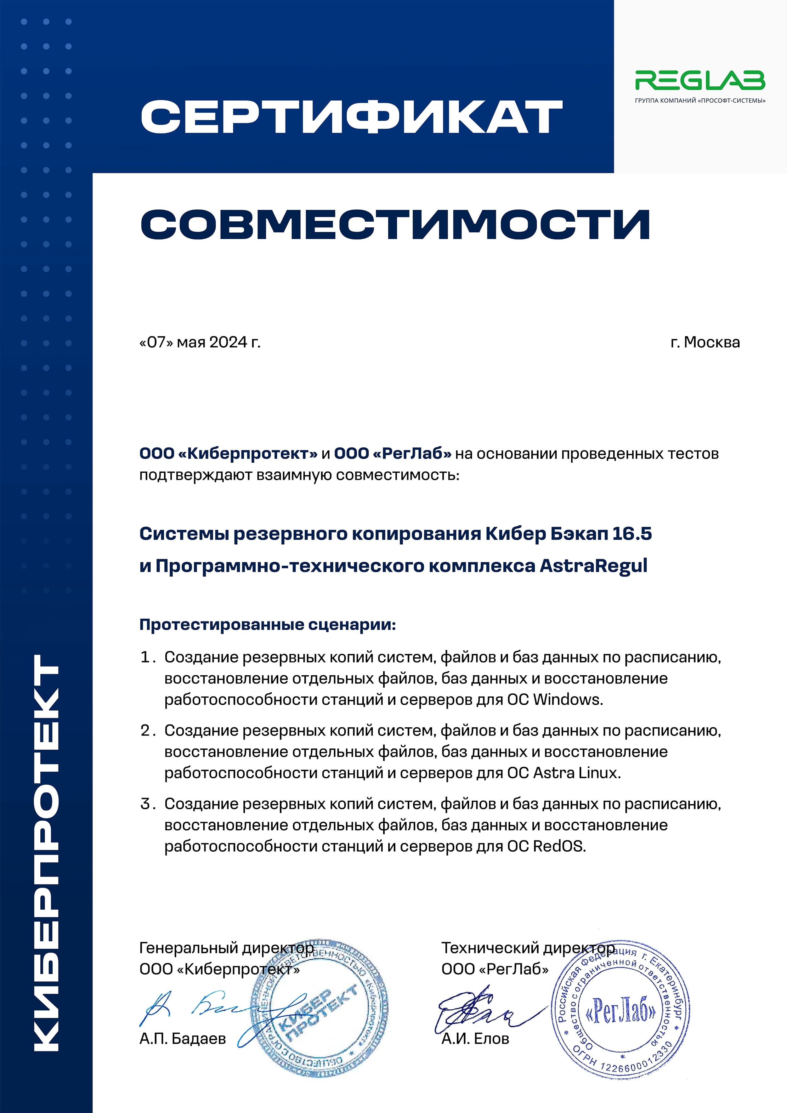 Сертифицированная совместимость системы резервного копирования Кибер Бэкап 16.5 и программно-технического комплекса AstraRegul позволяет создавать резервные копии систем, файлов и баз данных, а также восстанавливать работоспособность станций и серверов под управлением ОС Windows, Astra Linux и РЕД ОС.