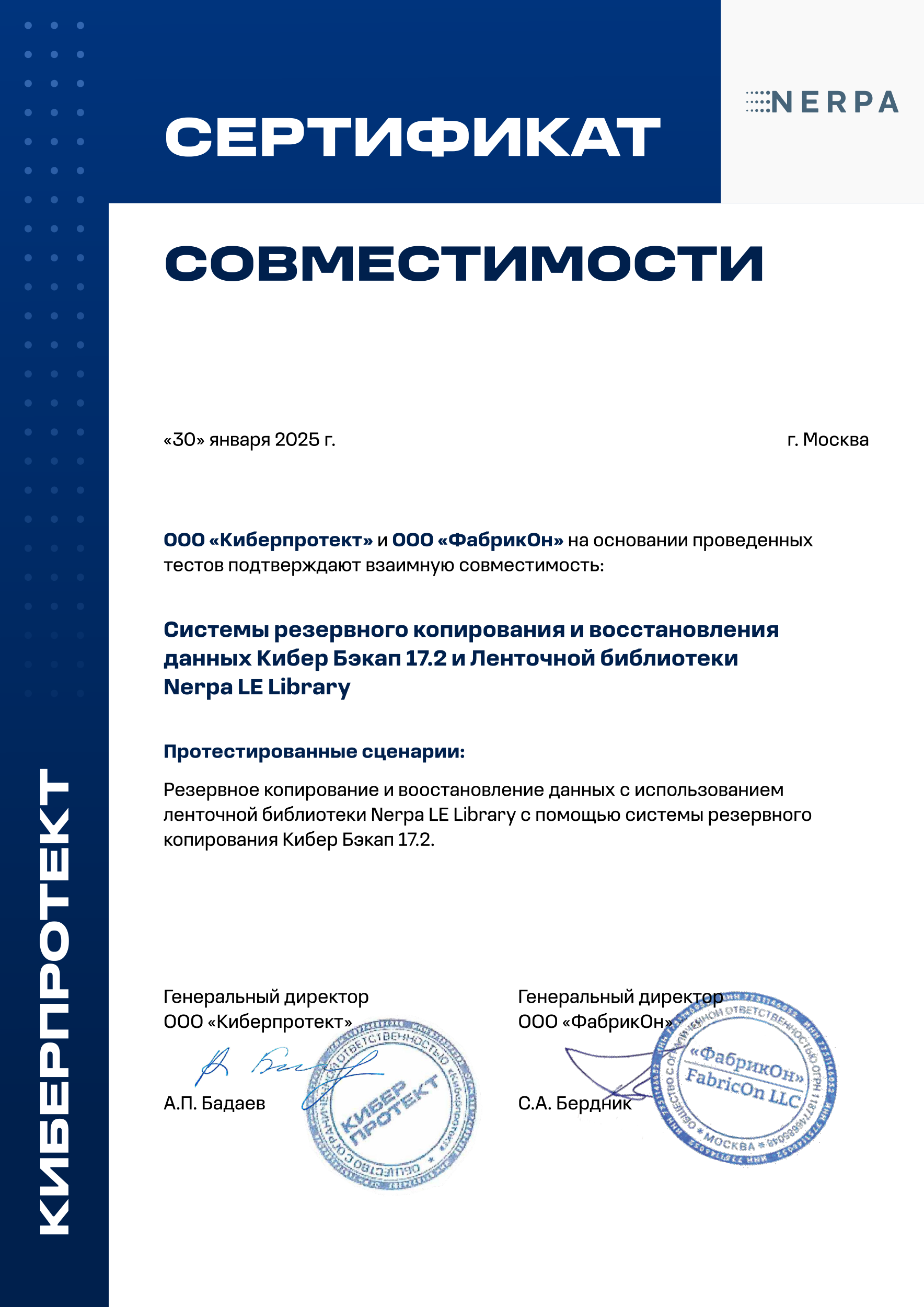 Надежность хранения резервных копий повышается за счет совместного использования ленточной библиотеки Nerpa LE Library и СРК Кибер Бэкап 17.2.