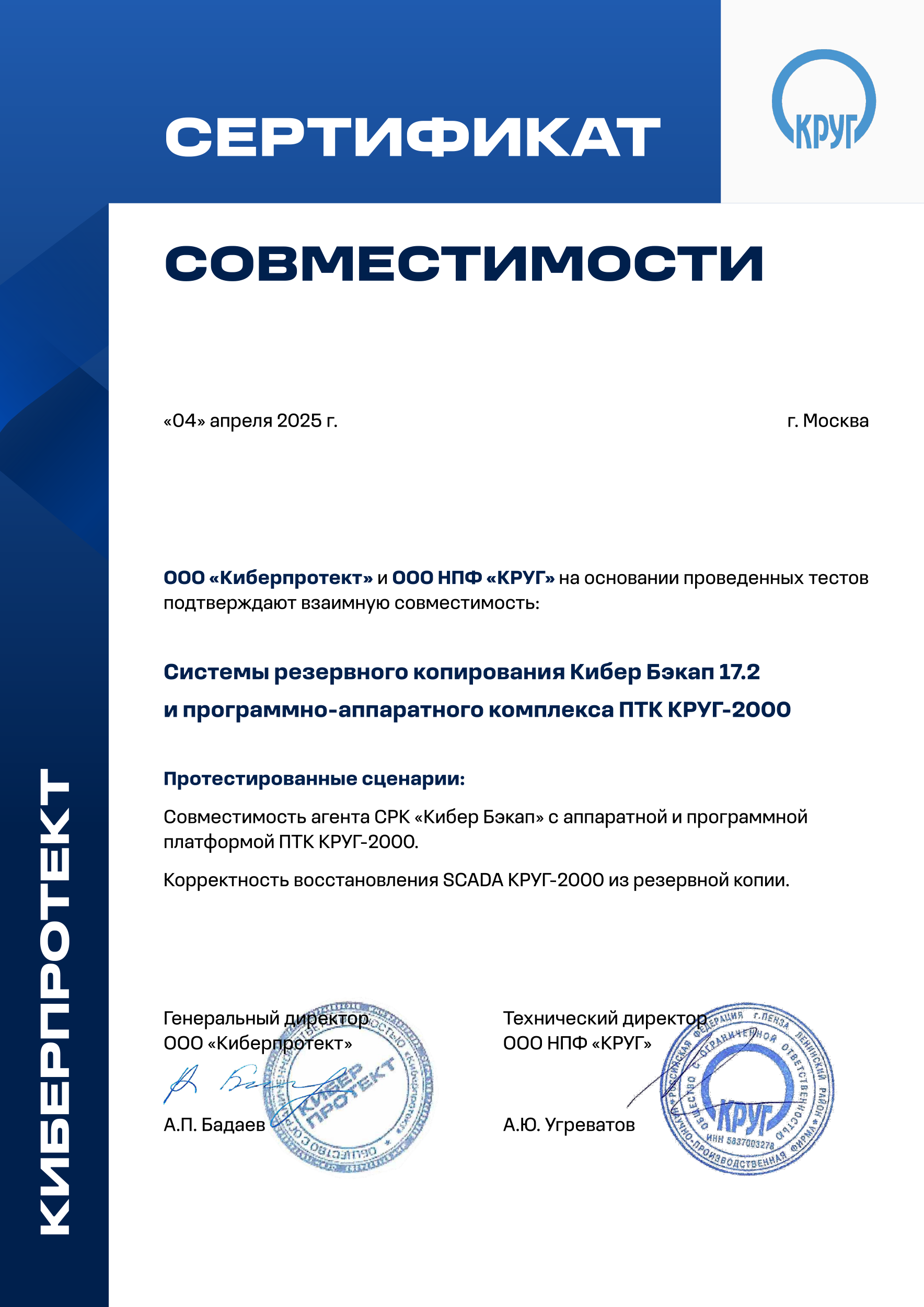 Совместимость СРК «Кибер Бэкап» с аппаратной и программной платформой ПТК КРУГ-2000 позволяет обеспечить сохранность данных технологических процессов.