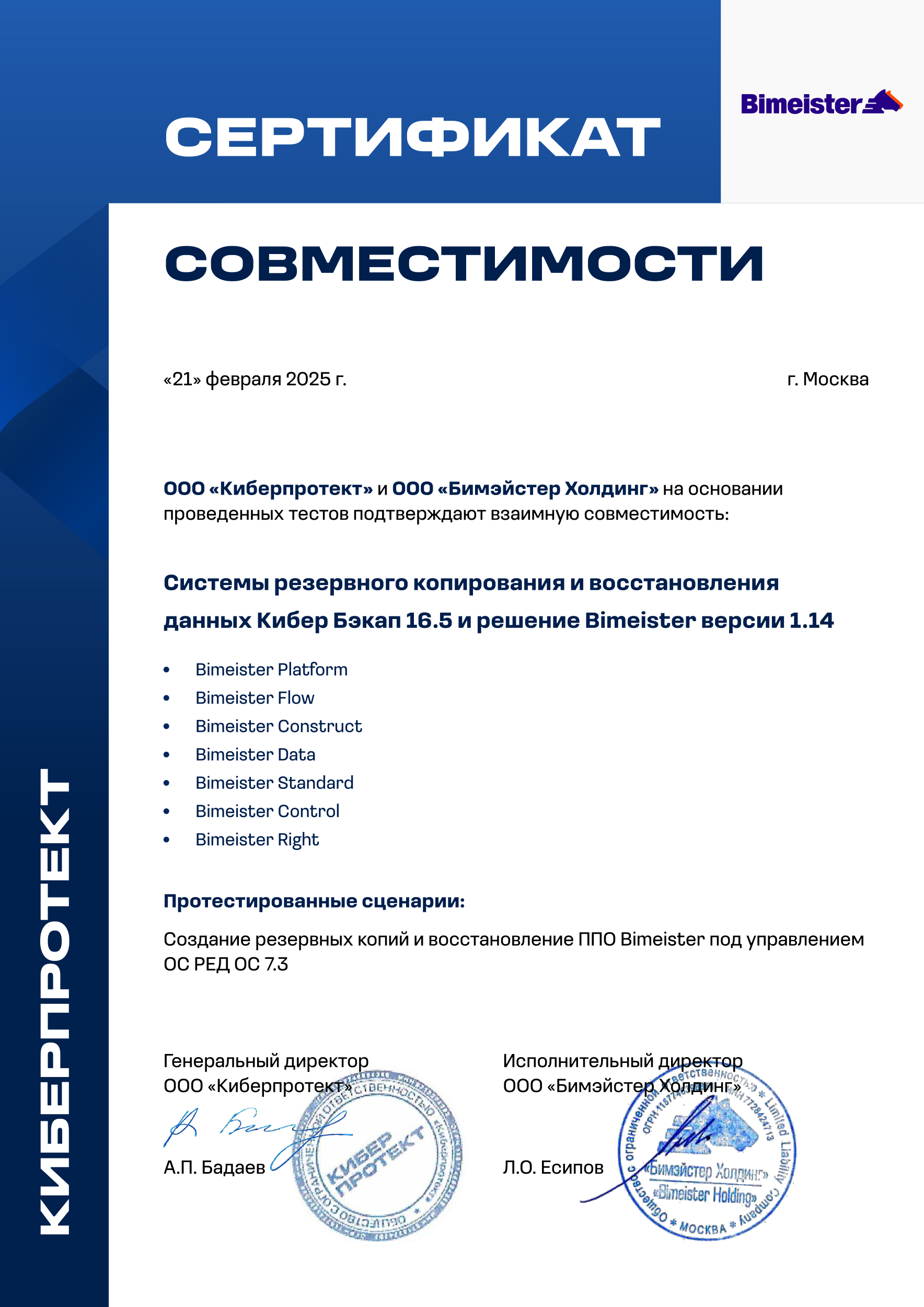 Совместимое решение обеспечивает резервное копирование и восстановление данных продуктов компании Bimeister: Bimeister Platform, Bimeister Flow, Bimeister Construct, Bimeister Data, Bimeister Standard, Bimeister Control, Bimeister Right.