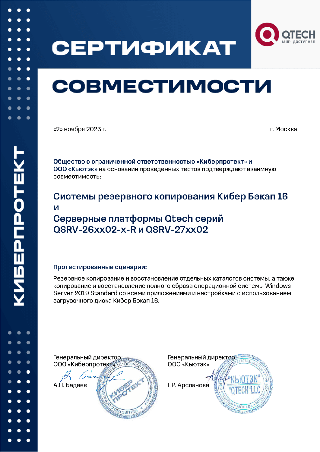 Интегрированное решение обеспечивает резервное копирование и восстановление отдельных каталогов системы, работающей на серверной платформе Qtech. Также поддерживается копирование и восстановление полного образа операционной системы Windows Server со всеми приложениями и настройками с использованием загрузочного диска Кибер Бэкап 16.