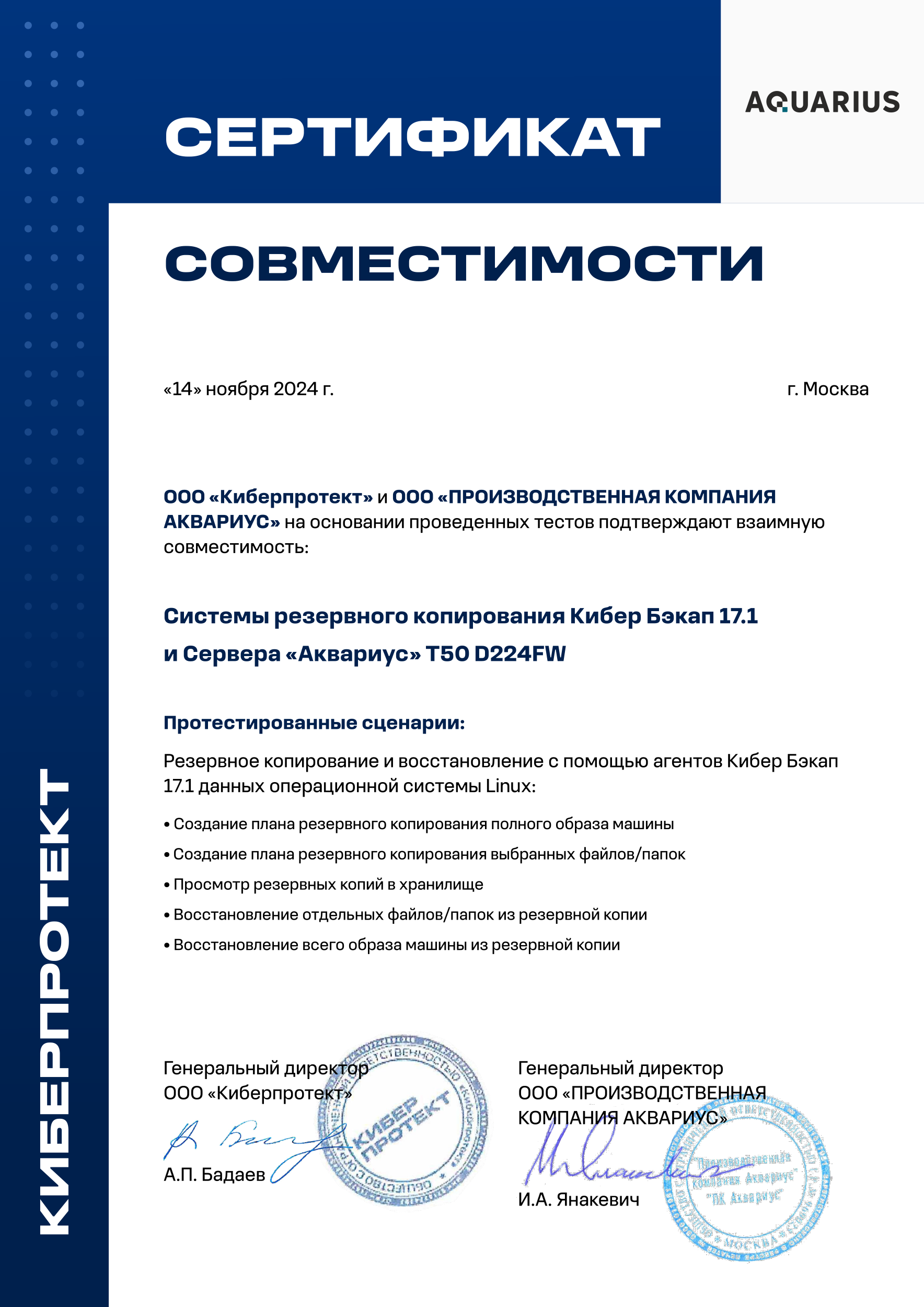 Использование СРК Кибер Бэкап для резервного копирования и восстановления с помощью агентов версии 17.1 данных операционной системы Linux, установленной на сервере модели T50 D224FW, обеспечивает защиту данных ОС и приложений.
