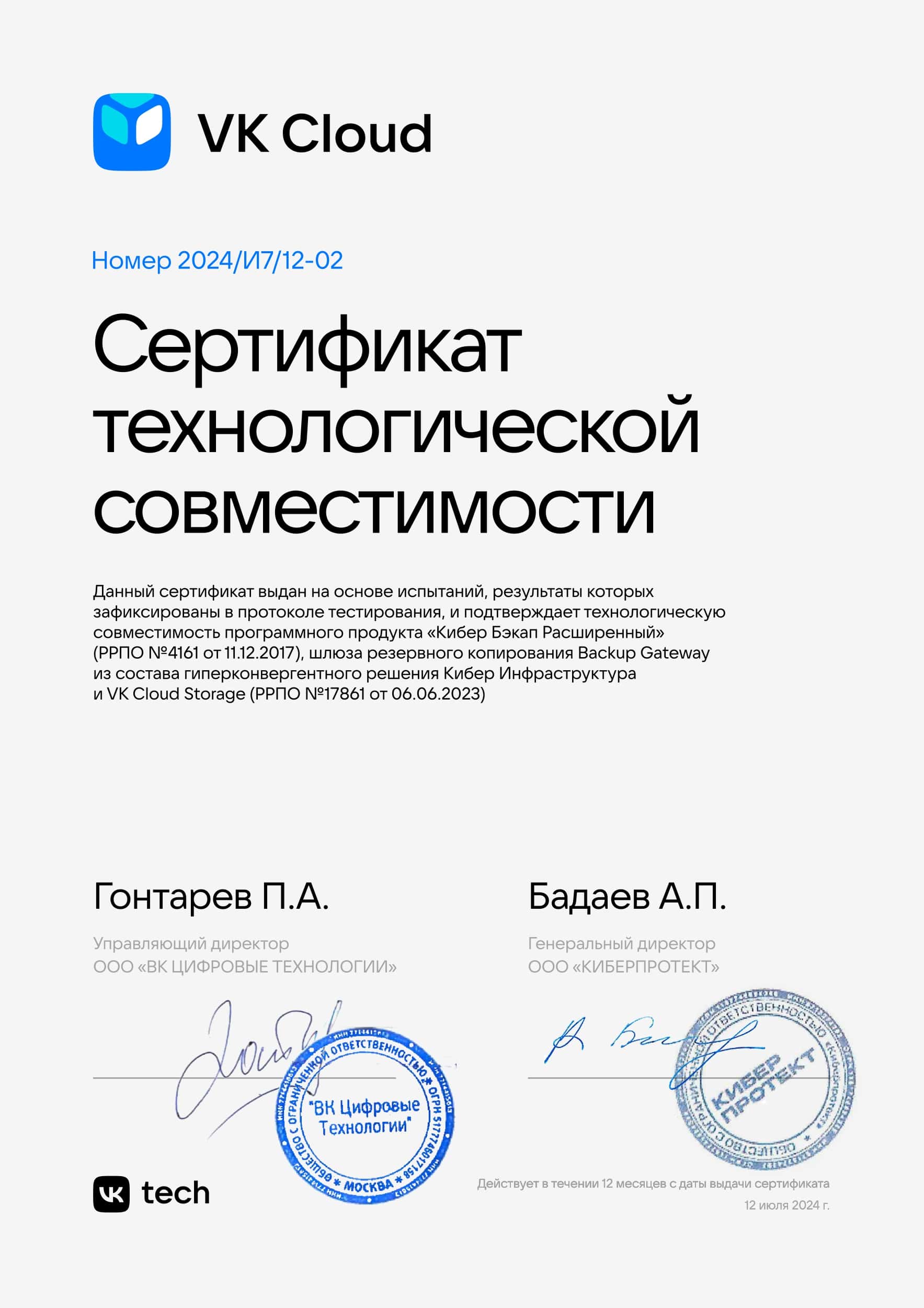 Интегрированное решение позволяет использовать облачное S3-хранилище VK Cloud Storage для хранения резервных копий, созданных системой резервного копирования Кибер Бэкап, с использованием шлюза резервного копирования Backup Gateway из состава гиперконвергентного решения Кибер Инфраструктура.