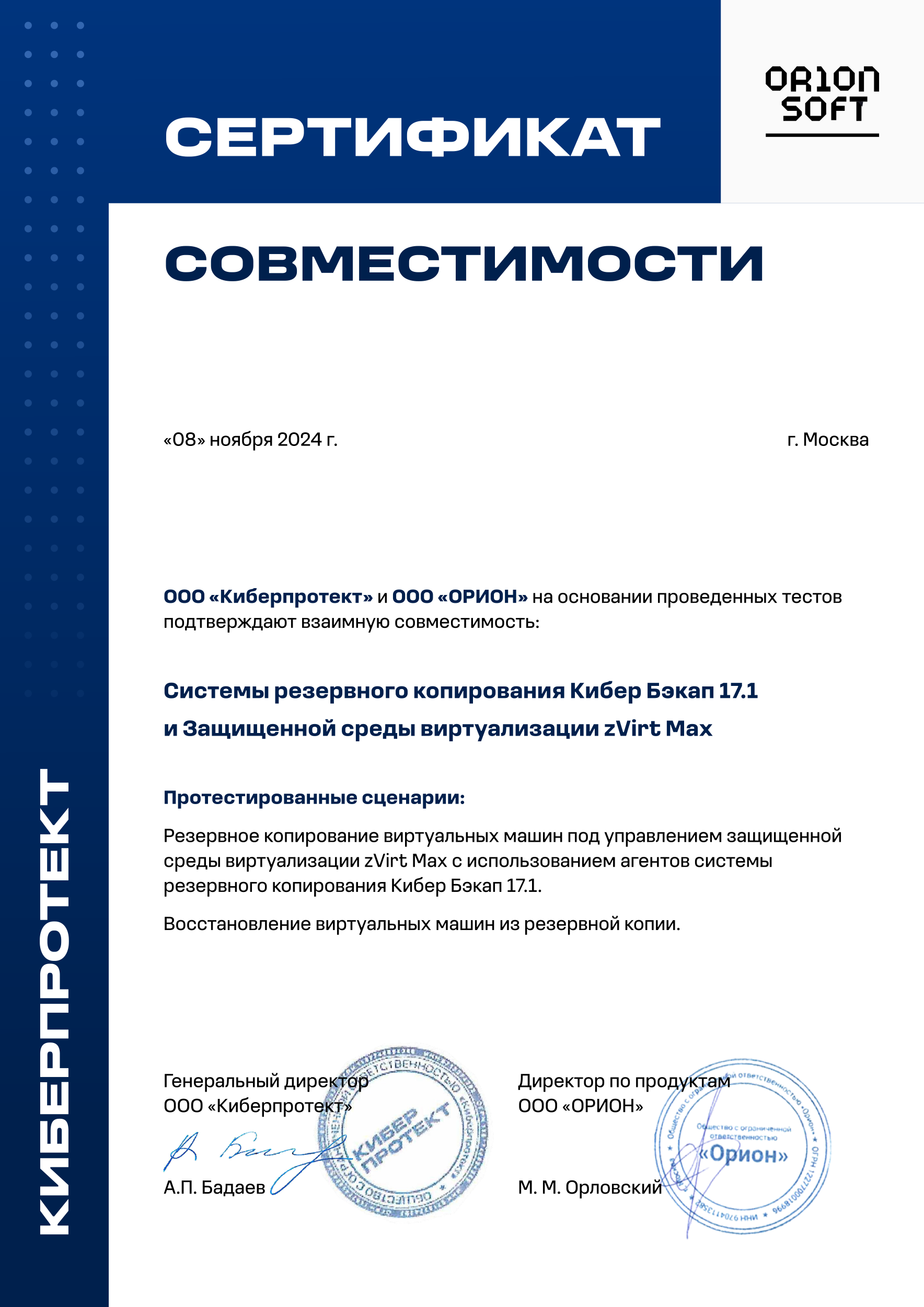 Совместимость системы резервного копирования Кибер Бэкап 17.1 и защищенной среды виртуализации zVirt Max обеспечивает надежное резервное копирование виртуальных машин под управлением zVirt Max с использованием агентов Кибер Бэкапа 17.1, а также восстановление виртуальных машин из резервных копий.