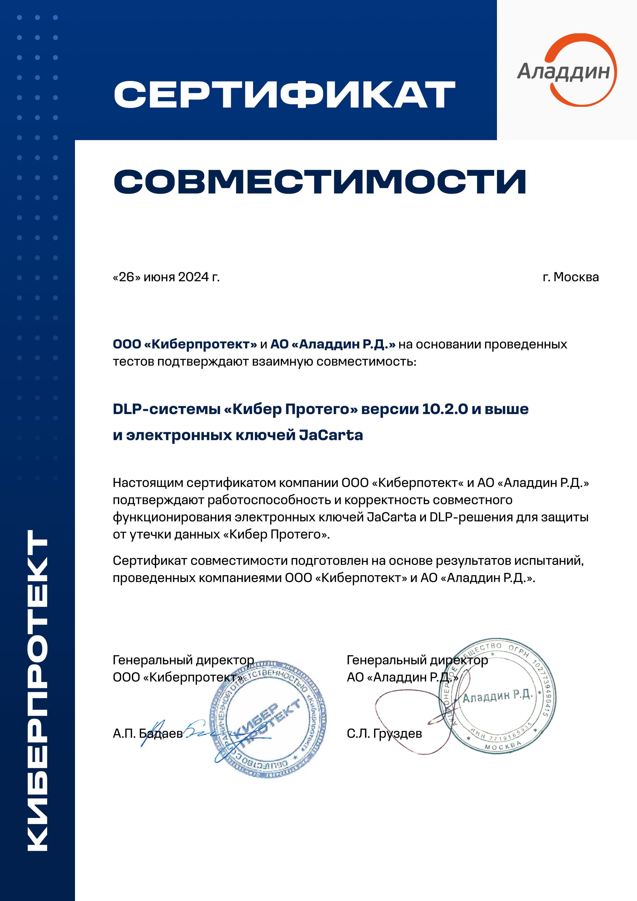 Решение обеспечивает работоспособность и корректное совместное функционирование DLP-системы Кибер Протего и электронных ключей JaCarta.