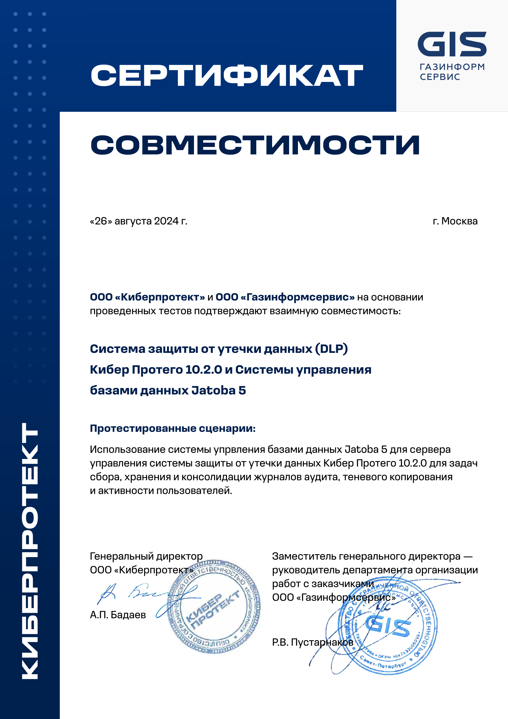 Сервер управления Кибер Протего 10 может использовать СУБД Jatoba 5 для задач сбора, хранения и консолидации журналов аудита, теневого копирования и активности пользователей.